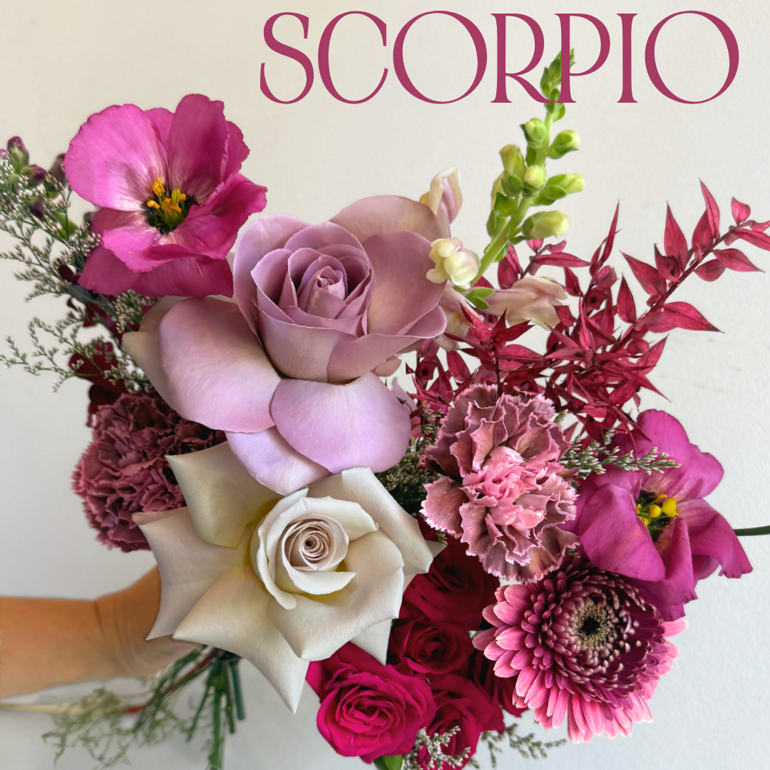 Our Scorpio bouquet is designed in a moody palette consisting of roses, spray roses, gerberas, snapdragons, lisianthus, carnations, limonium and dried ruscus.*