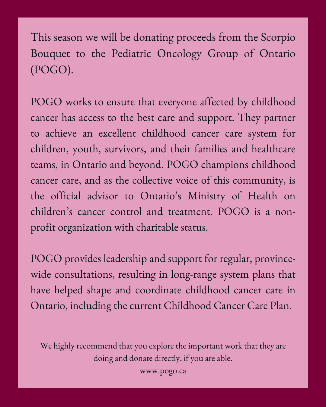 With each bouquet purchased, $10 will be donated to the Pediatric Oncology Group of Ontario.