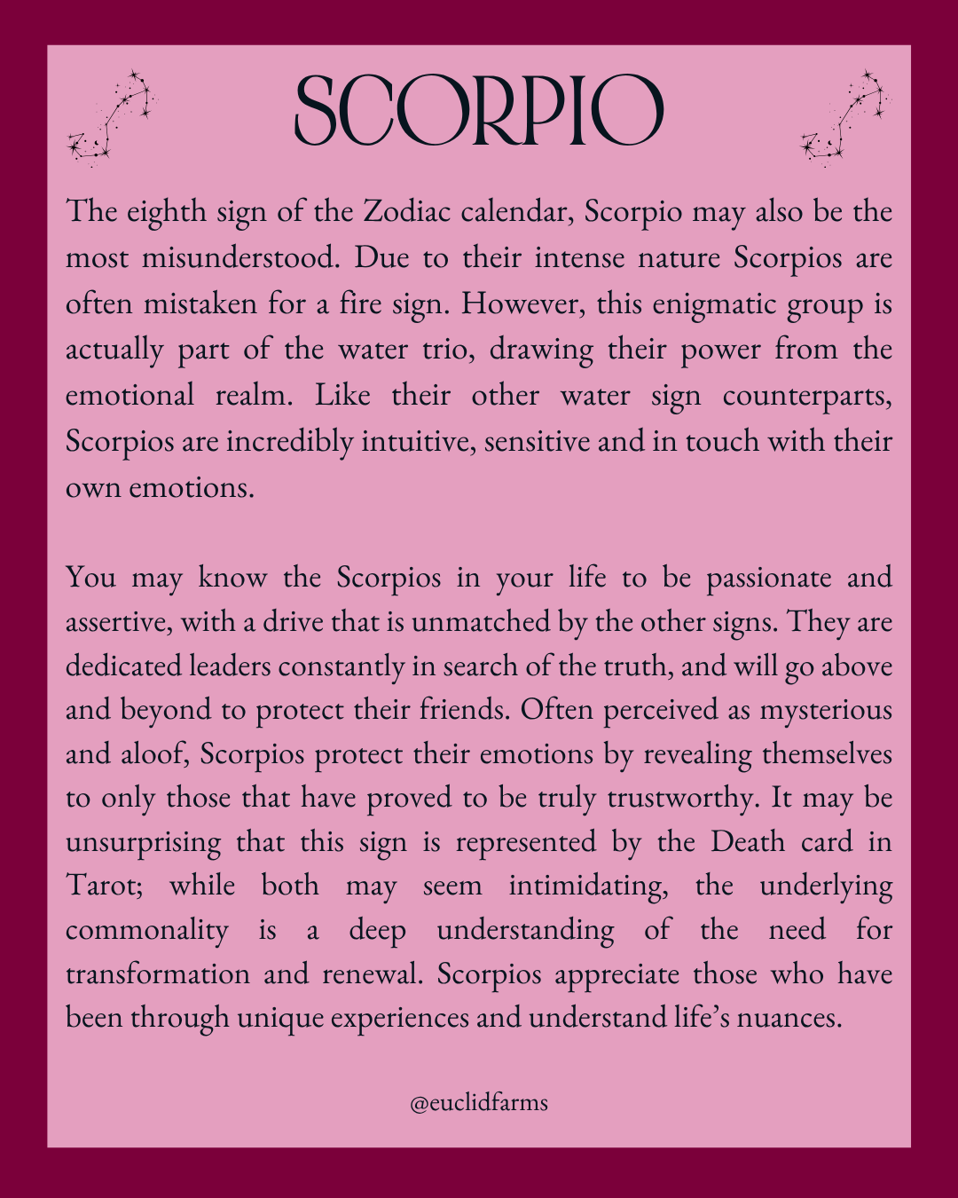 You may know the Scorpios in your life to be passionate and assertive, with a drive that is unmatched by the other signs. They are dedicated leaders constantly in search of the truth, and will go above and beyond to protect their friends. Often perceived as mysterious and aloof, Scorpios protect their emotions by revealing themselves to only those that have proved to be truly trustworthy. It may be unsurprising that this sign is represented by the Death card in Tarot; while both may seem intimidating, the underlying commonality is a deep understanding of the need for transformation and renewal. Scorpios appreciate those who have been through unique experiences and understand life’s nuances.