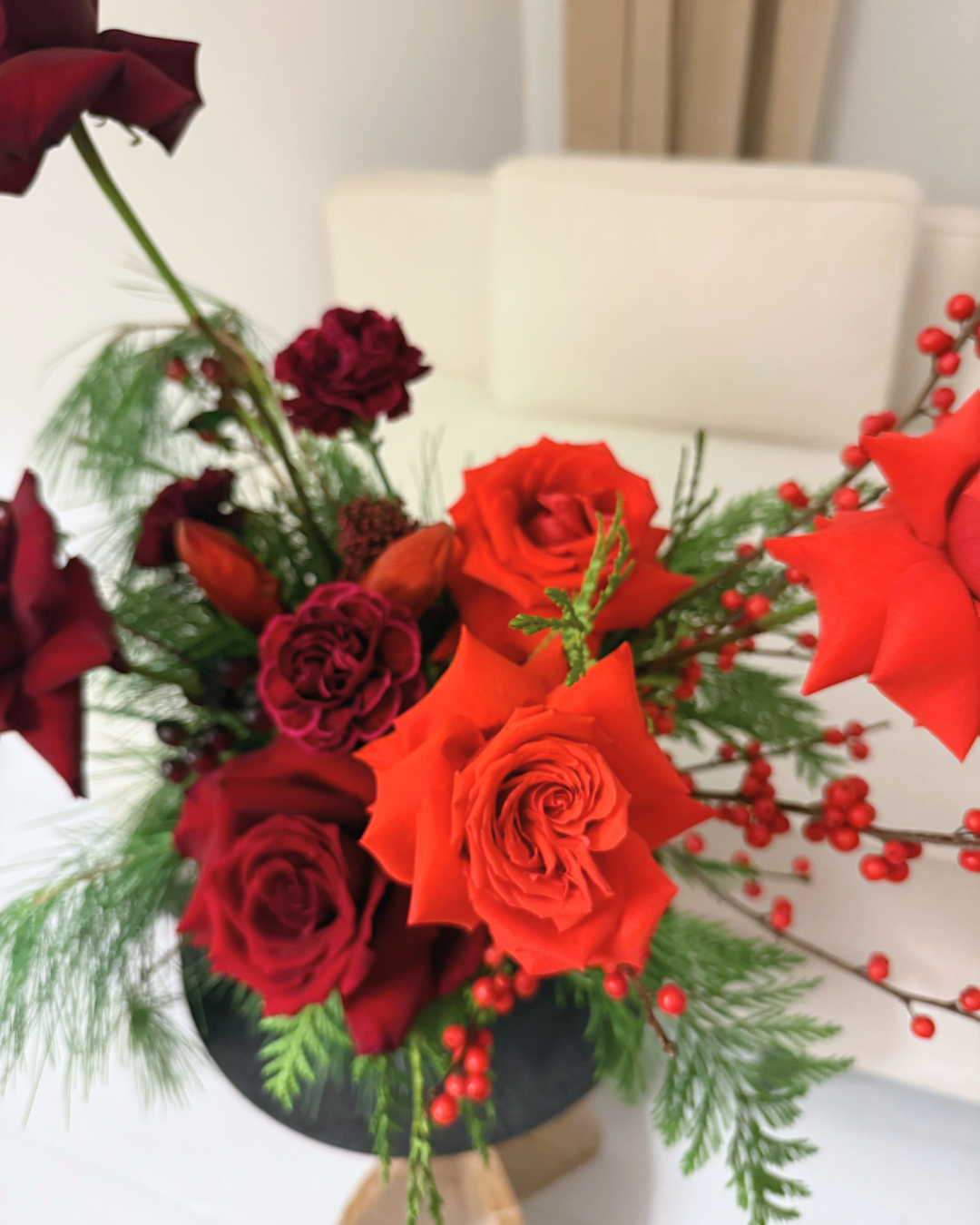 Looking to really brighten up your decor this year? Look no further. This gorgeous red and green arrangement will capture everyone's attention. The vibrant ilex and Nina roses (an EF favourite) combined with the rich reds and greens create a festive and eye-catching piece that will bring joy to everyone.