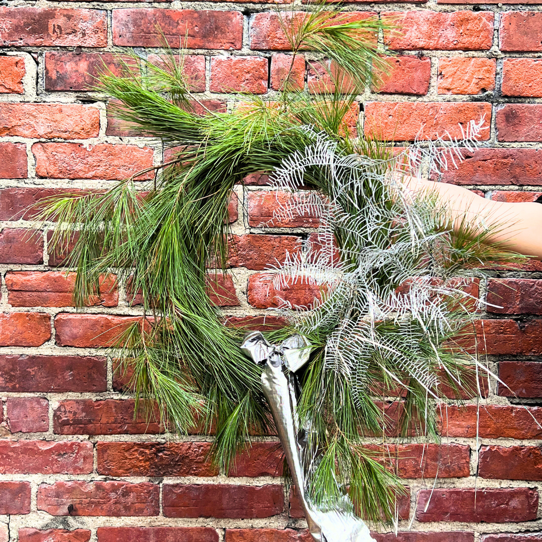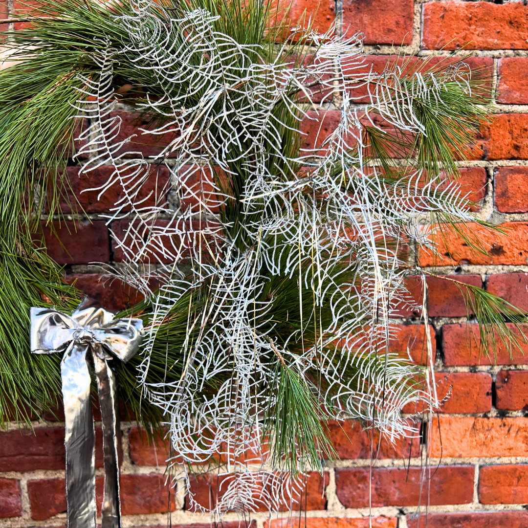 Celebrate the season of shimmering icicles and glistening snowbanks with our new Tinsel Town wreath! Made with a 12" grapevine base, this wreath features a metallic silver bow, silver fern stems and wild pine branches draped in shiny tinsel.